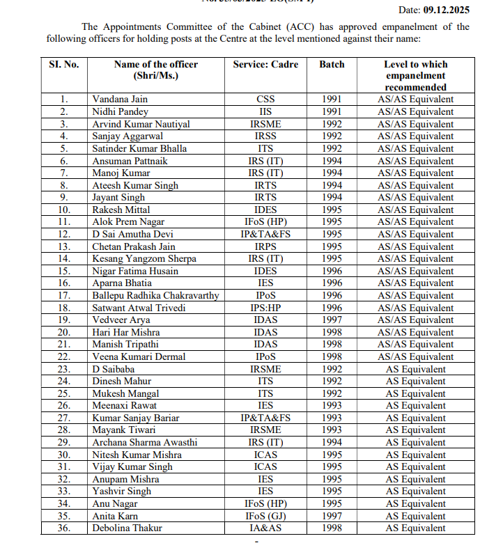 Thirty Six officers belonging to various services and batches have been empanlled to Additional Secretary grade in Government of India. Official order has been issued by the Government of India.